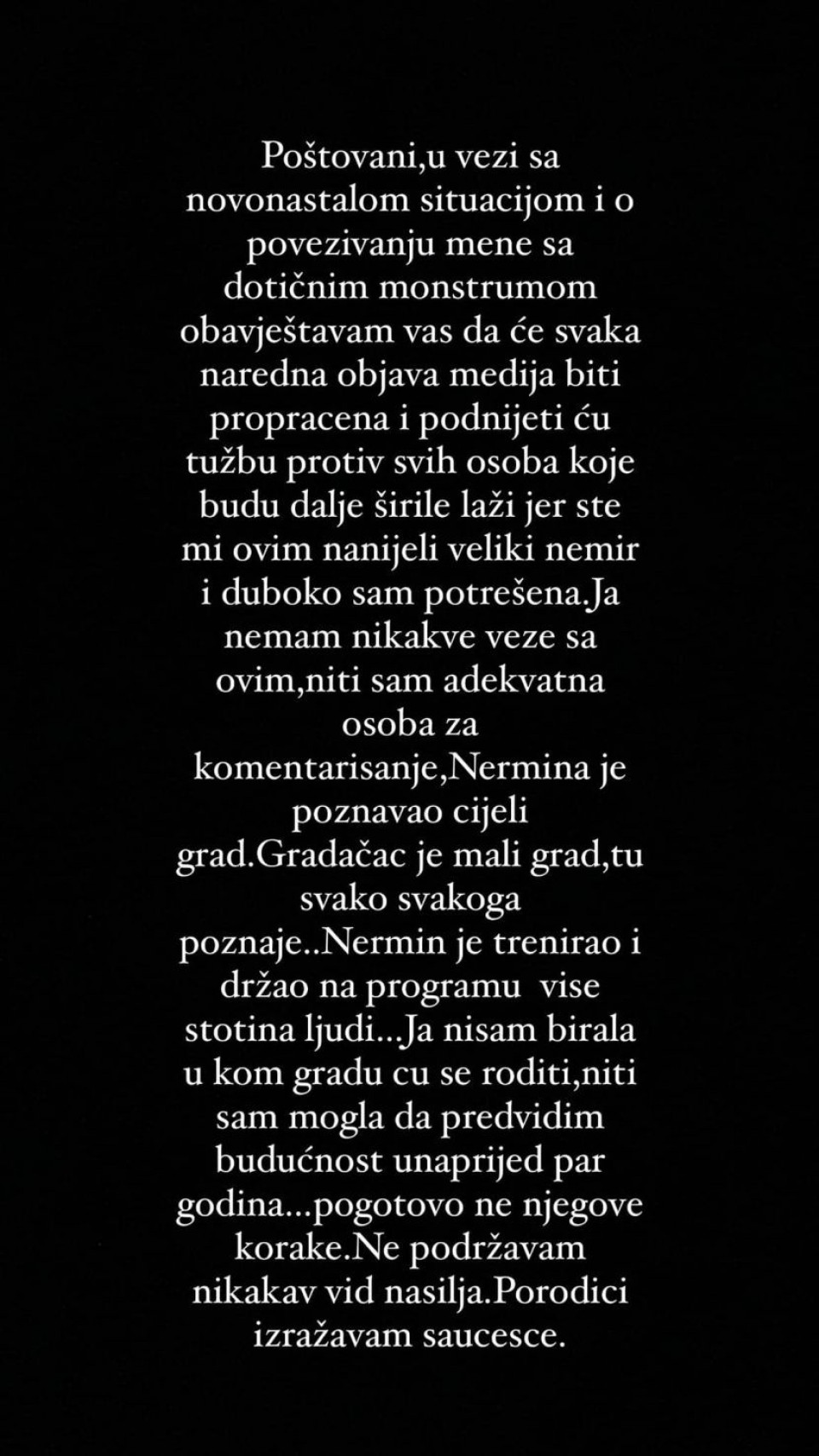 I sama pjevačica kaže da je u šoku zbog svega i poručuje da nije mogla da zna šta će Nermin uraditi u budućnosti, kao i da ga je cijeli grad poznavao.