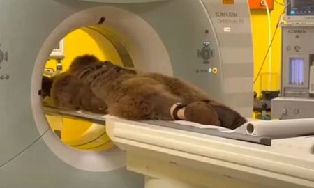 Neobična snimka medvjeda teškog 90 kilograma s uzrujanim želucem, kojeg su na nosilima prevezli na magnetsku rezonancu, ovog je tjedna postala viralna...