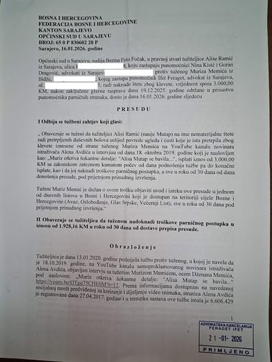 Općinski sud u Sarajevu odbacio je tužbu Alise Ramić Mutap za klevetu protiv Muriza Memića, oca Dženana Memića.