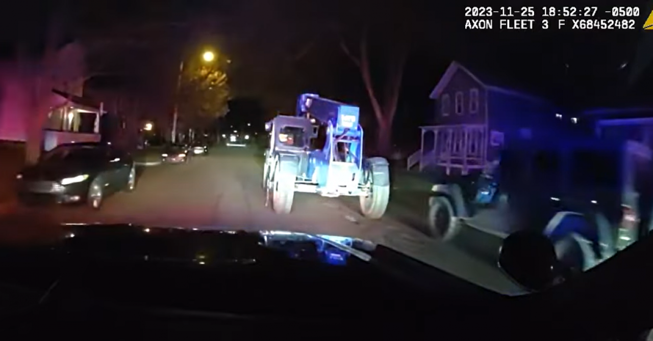 Policija je brzo reagirala nakon što je primijetila dječaka kako vozi stroj prema središtu grada. Snimke s policijskih kamera prikazuju dječaka kako riskira kod skretanja, ruši prometne znakove i sudara se s čak 10 parkiranih vozila duž ceste.